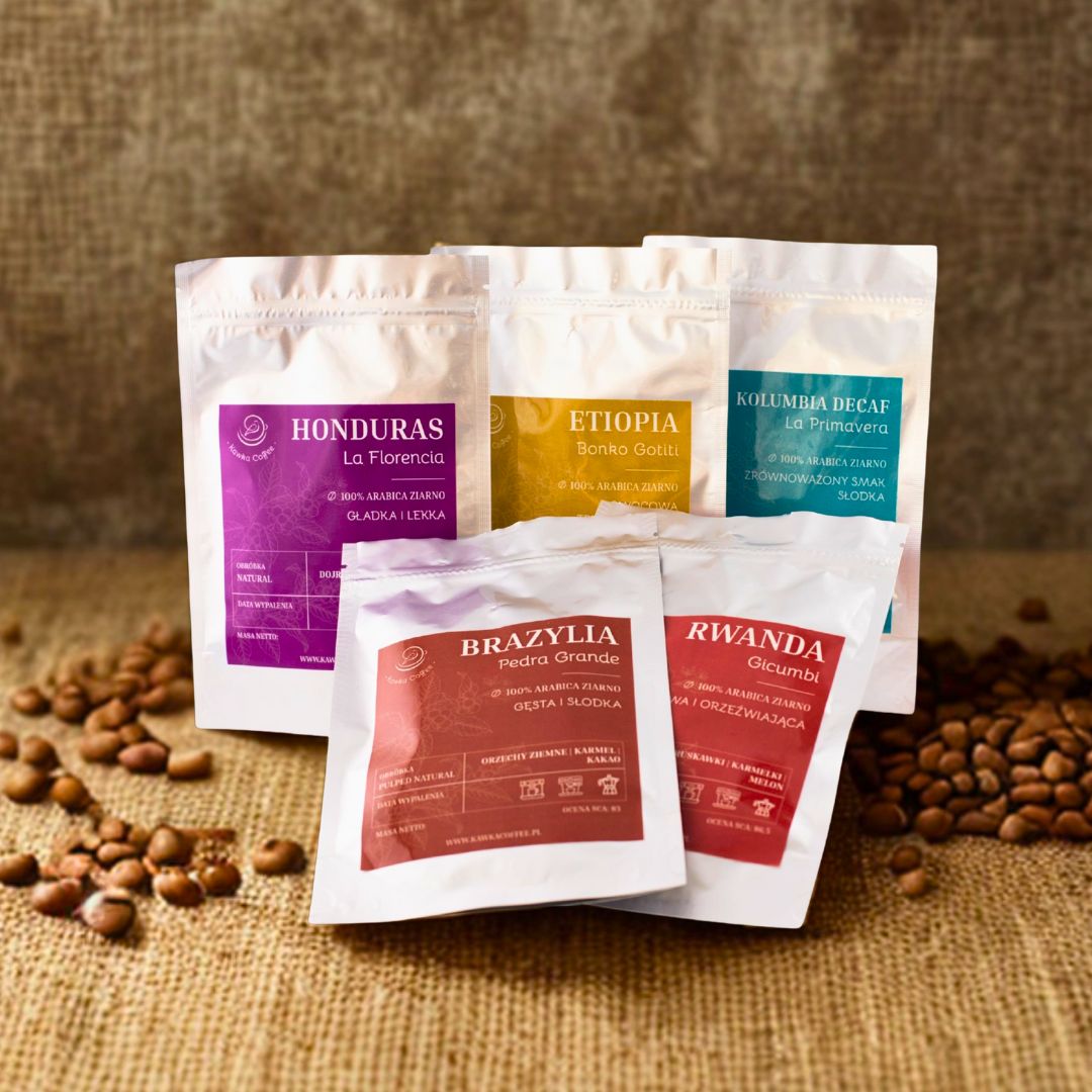 Nie wiesz, którą kawę wybrać? Mamy rozwiązanie. Zestaw próbek to 5 świeżo palonych kaw w opakowaniach po 40 g – każde wystarczy na ok. 4 filiżanki.